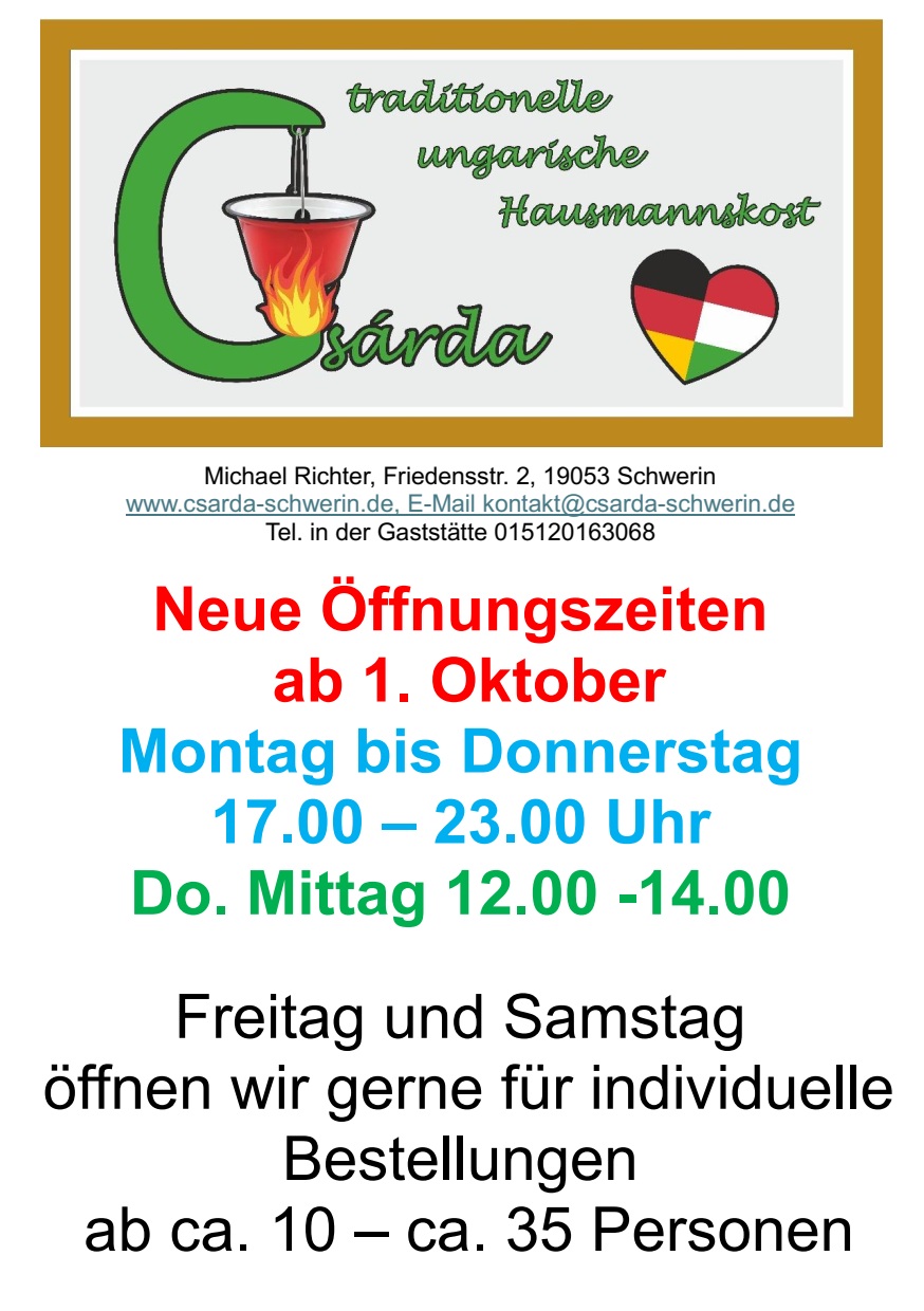 Ab jetzt haben wir von Montag bis Donnerstag jeden Abend von 17 bis 23 Uhr geöffnet, und Gruppen ab 10 Personen können auch für Freitag und Samstag reservieren.